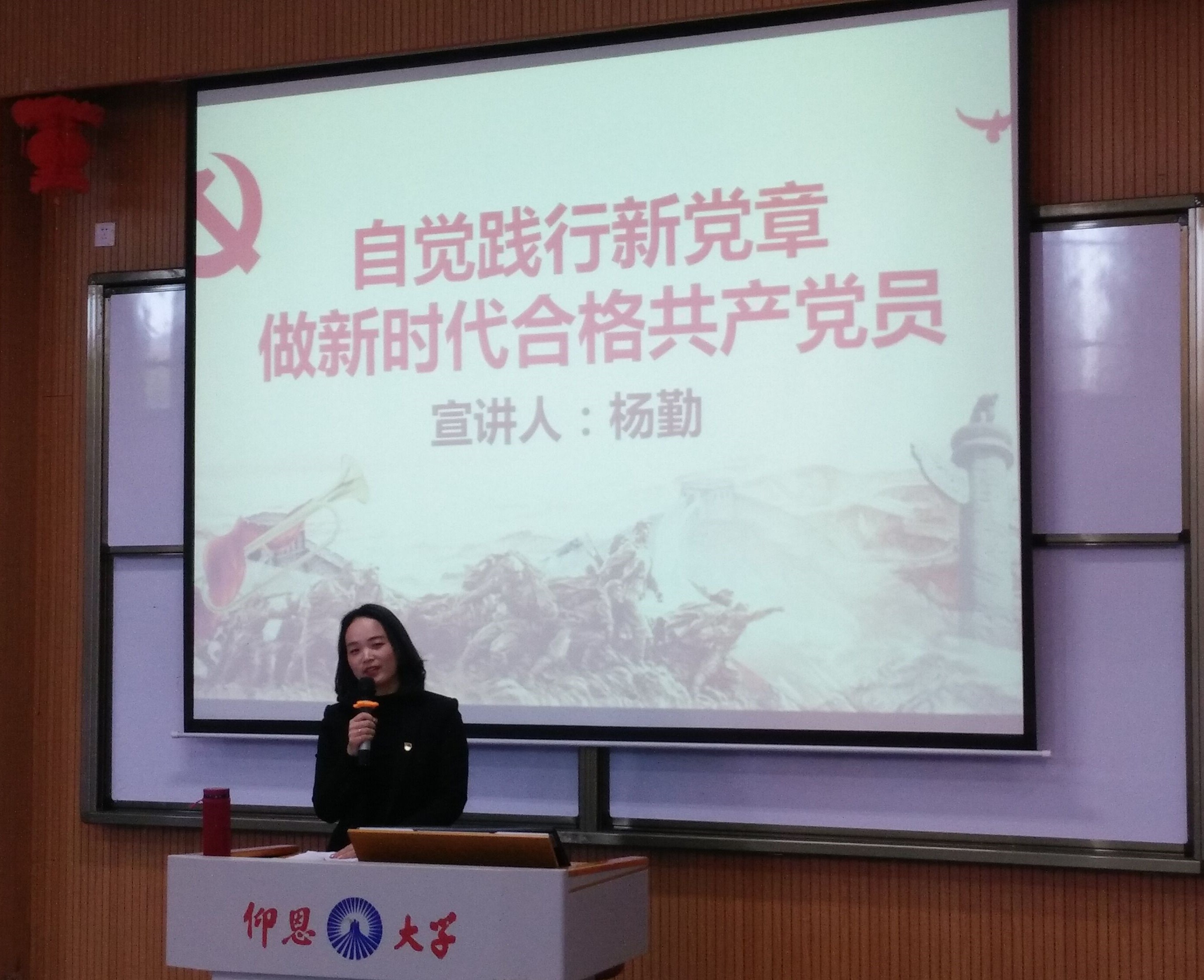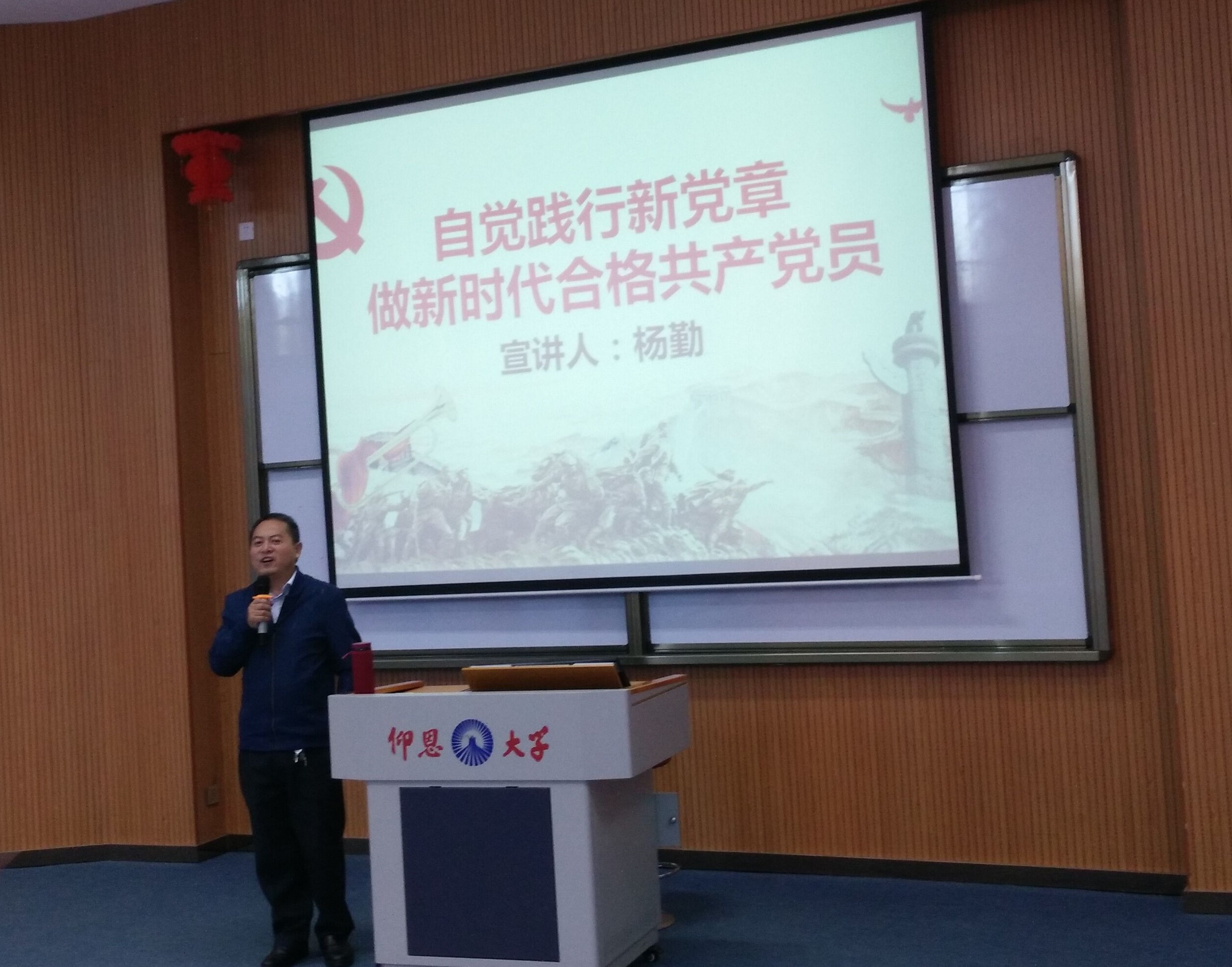 2018年11月29日下午,仰恩大学团委书记、政法学院党总支书记杨勤于和昌楼博雅讲堂做了题为“自觉践行新党章 做新时代合格共产党员”的理论宣讲。活动由思政部副主任李克钦主持,思政部全体教师、人文学院全体学生聆听了此次宣讲。