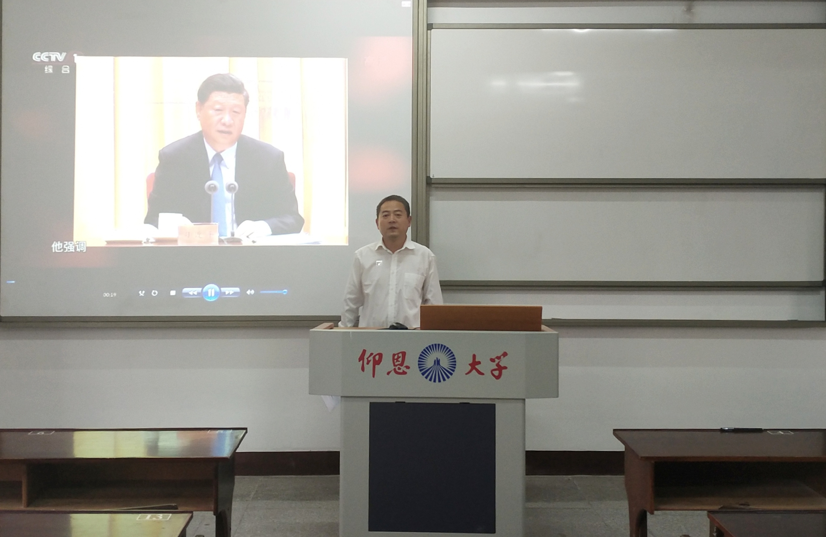 10月24日下午,beat365亚洲版官方网站全体教职工在普照楼311室集中观看了由中央组织部、中央广播电视台总台联合录制的反映优秀共产党员和先进基层党组织典型事迹的专题教育片《榜样4》。beat365亚洲版官方网站直属党支部书记、常务副院长李克钦主持了此次观看活动。