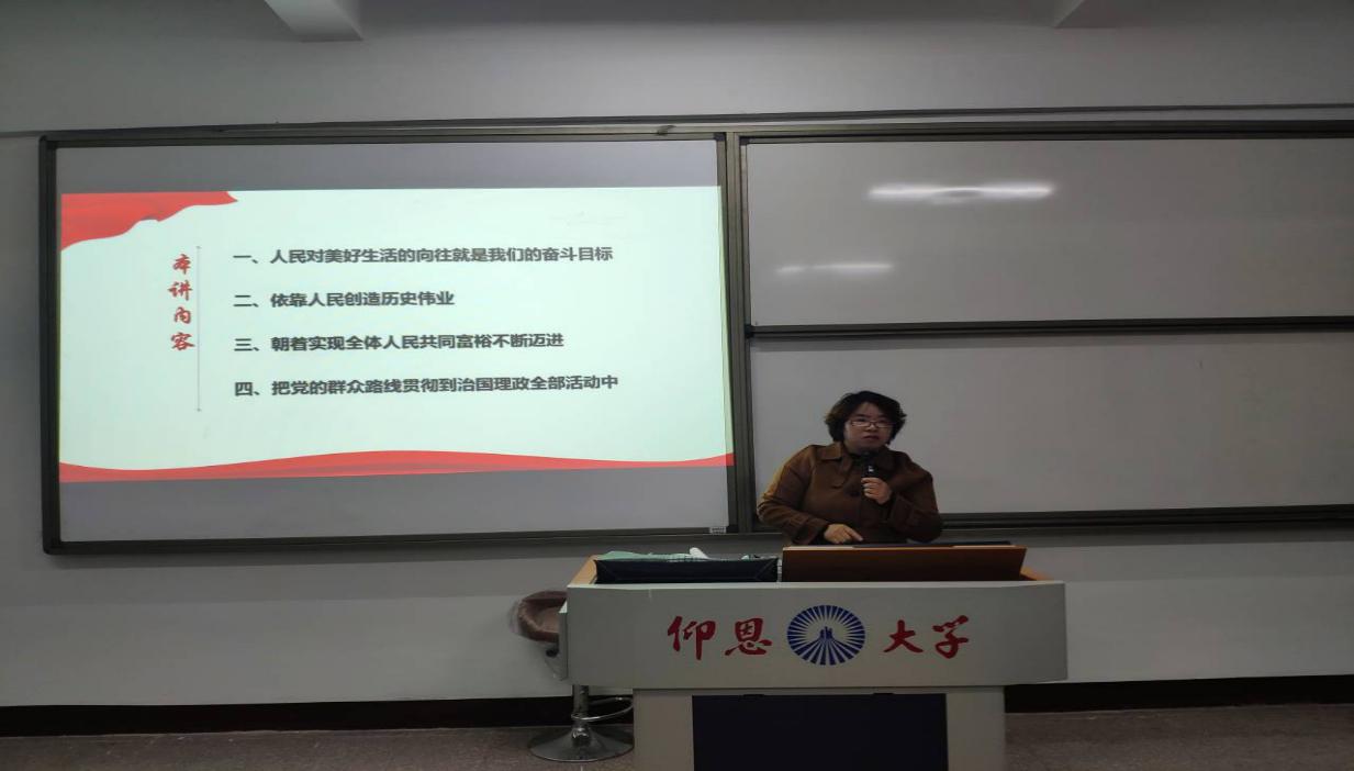章娇娜老师以幽默生动的语言向我们阐述了以人民为中心的重要性,从八个明确、十四个坚持到中国共产党以人民为中心的初心和使命——为中国人民谋幸福、为中华民族谋复兴,在章娇娜老师的讲解下同学们对党以人民为中心的根本立场有了深刻的理解。