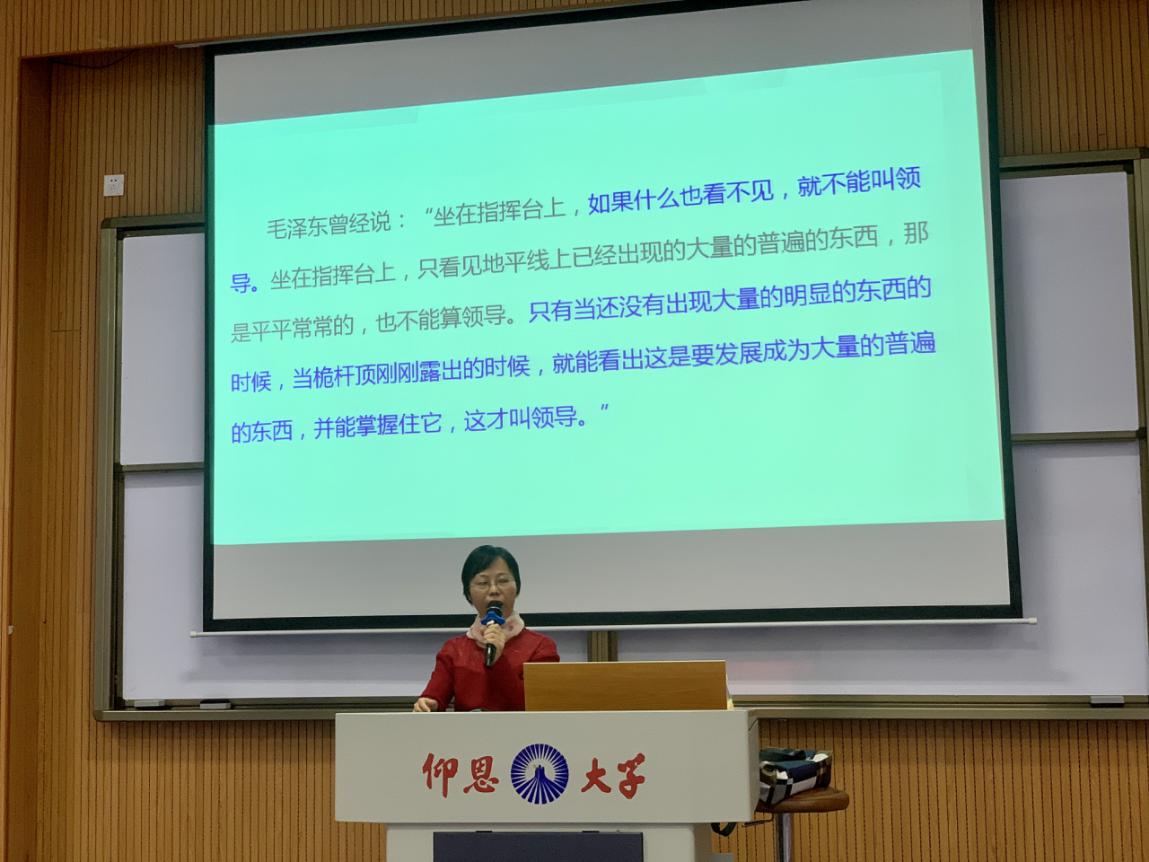 杨老师主要从《星星之火,可以燎原》的写作背景、主要内容和文章蕴含的马哲原理与方法三方面展开。她谈到,要遵循物质决定意识的原理,坚持一切从实际出发的方法;要明辨现象与本质的关系,学会透过现象看本质;要自觉的将矛盾的分析法运用到生活中;要正确认识量变与质变的辩证关系,重视量的积累,不失时机促成质的飞跃。讲座接近尾声,杨老师如是说“花瓶易碎容颜易老,唯有知识历久弥新”与大家共勉。