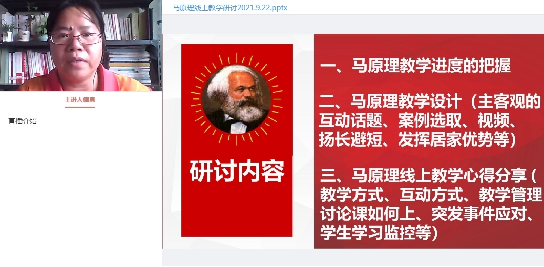 9月22日下午,在唐锦锋副院长的建议下,马克思主义基本原理课程教研组召开了教学研讨会。因为疫情防控需要,会议调整至线上进行。马克思主义基本原理课程负责人章娇娜主持会议。