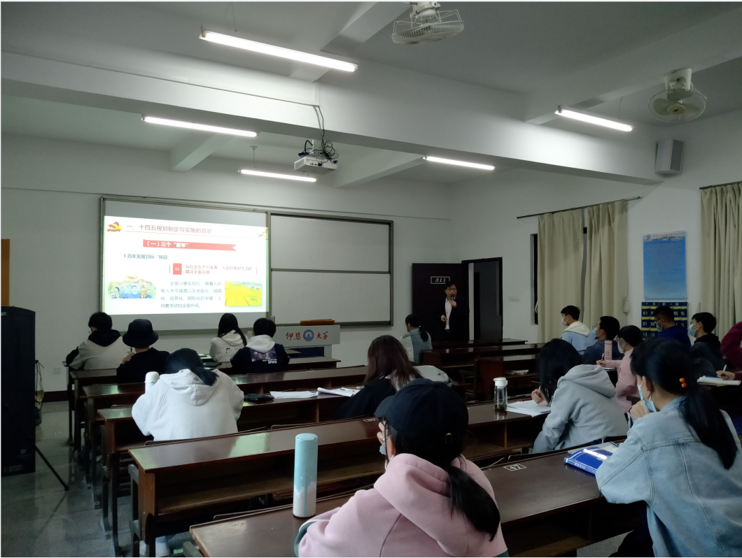 讲座伊始,袁老师以中国共产党的一个主题,两个始终,四个奋斗进程为开篇,隆重的介绍了中国共产党百年奋斗史主线主题主流本质。回顾从“一五”到“十四五”的历史进程,反映了中国共产党人立志民族复兴伟业的初心使命与历史担当,始终提醒着同学们这伟大的历史进程是共产党人前赴后继,一棒接一棒、一代接一代,在逐梦现代化的道路上矢志不渝的生动写照,是中国共产党创立的“中国之治”历史之传承。接下来袁老师以三个“百年”开启了“十四五”建设社会主义现代化的新征程。在袁老师讲诉“十三五”中国所取得的伟大成就的时候,同学们投入的听着,为中国所取得成就发出赞叹的声音。紧接着袁老师介绍了“十四五”发展的主要目标和工作部署,让“十四五”建设社会主义现代化的新征程在创辉煌佳绩。最后袁老师以“十四五”规划建议的新时代特征作为总结,强调了同学们要全面深刻理解“十四五”规划建议,在历史的维度中进行比较,发现改善不足,更加完善优点。最终再次明确了“习近平新时代中国特色社会主义思想”的指导地位。
