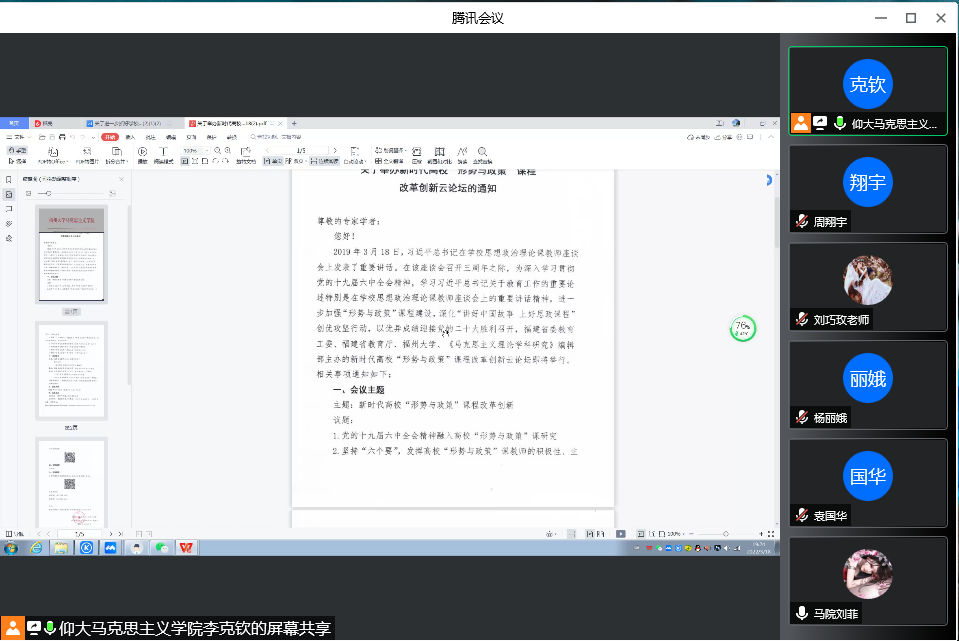 之后,学院教师针对疫情期间的教学教研工作进行交流讨论。李克钦指出,各位教师要积极参加近期福建省教育厅所举办的高校思政课集体备课以及“形势与政策”教学改革创新会,学习各大高校的思政课教学优秀经验。在线上教学方面,各位教师对教学进度以及教学中存在的问题进行了交流,并一致认为要提高教学质量,监督学生的听课情况。此外,与会教师还对概论课实践教学中涉及的意识形态问题、优秀教学案例征集、说课比赛问题等进行了讨论。