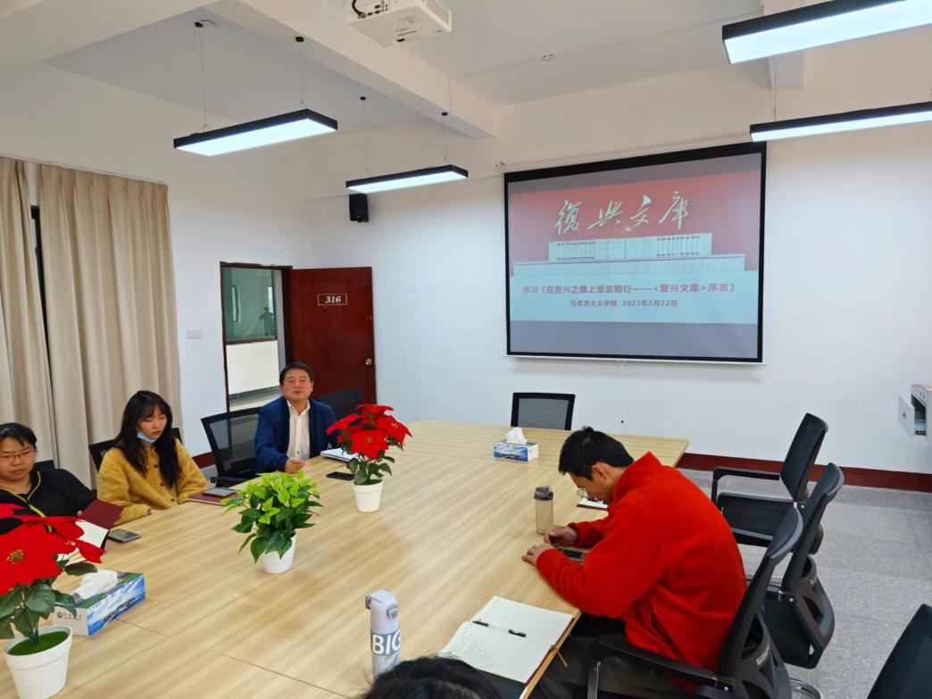 2月22日下午,beat365亚洲版官方网站全体教职工在普照楼316会议室举行本学期第一次理论学习会。本次会议学习习近平总书记为《复兴文库》系列丛书出版所题的序言——《在复兴之路上坚定前行》。