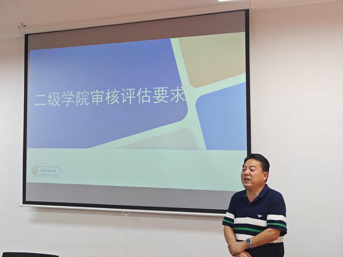 李克钦首先向大家强调了审核评估工作的重要性和紧迫性。他指出,审核评估工作不仅关系到学校的整体发展,也与每个人的切身利益息息相关,因此务必要做好充分的准备。随后,他从发展历程、评估分类、评估主题、评估项目、评估流程等方面向大家系统介绍了二级学院审核评估工作的具体要求。他特别指出,本轮审核评估重点在立德树人与思想政治教育领域,因此在准备材料的过程中要凸显出学院的教育教学特色,同时,他还要求大家充分熟悉学校的办学定位、专业建设、培养模式、课堂教学、实践教学等情况,以避免在材料的整理过程中出现原则性错误。