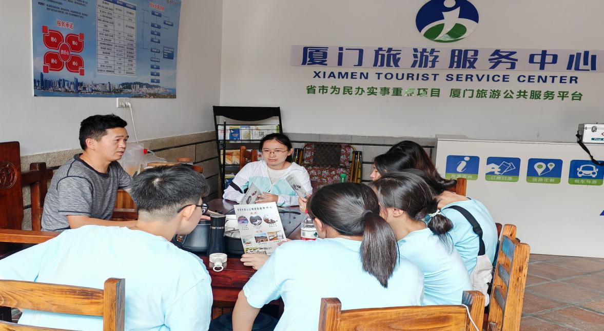沿着弯曲的山路盘旋而上,映入眼帘的是层层叠叠的茶田,错落有致的房屋和干净整洁的村庄道路。漫步在村庄中,清新的空气,优美的环境,令人心旷神怡。实践队成员们首先来到高山之家采访返乡创业青年高国达,他向实践队成员们介绍了军营村的基本情况。军营村是厦门最偏远的山村之一,曾经因为山高路远,很多青年人纷纷下山谋生,近几年越来越多从军营村走出去的青年回到村子创业,高国达也是积极响应政府号召,毅然选择返乡创业的青年之一。青年人回乡能够为乡村注入新鲜血液,将新理念和新技术带回乡村,助力乡村共同富裕。同时,他鼓励青年学子毕业后能用所学知识积极投身到乡村振兴的实践中。通过采访,实践队成员们进一步了解了军营村文旅产业的发展现状、优势和不足。