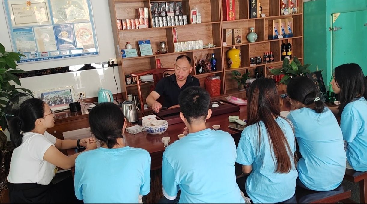 随后,实践队走进金香燕农庄与老板高金汉先生座谈。高先生介绍了军营村牢记总书记当年两上高山提出的“山下开发,山上戴帽”的嘱托。经过30多年的建设发展,昔日穷乡僻壤的穷山沟今日成为“绿富美”的新农村。近年来,军营村立足自然资源禀赋,把生态资源转化为旅游资源,既改善了农村人居环境,也切实提升农村居民收入。军营村现有民宿和农家乐70多家,300多间房间,400多张床位。高先生夫妇曾经是当地面朝黄土背朝天的茶农,2015年后他将自己家的楼房改建成了民宿农庄,经营民宿也为积极家庭带来了可观的收益。