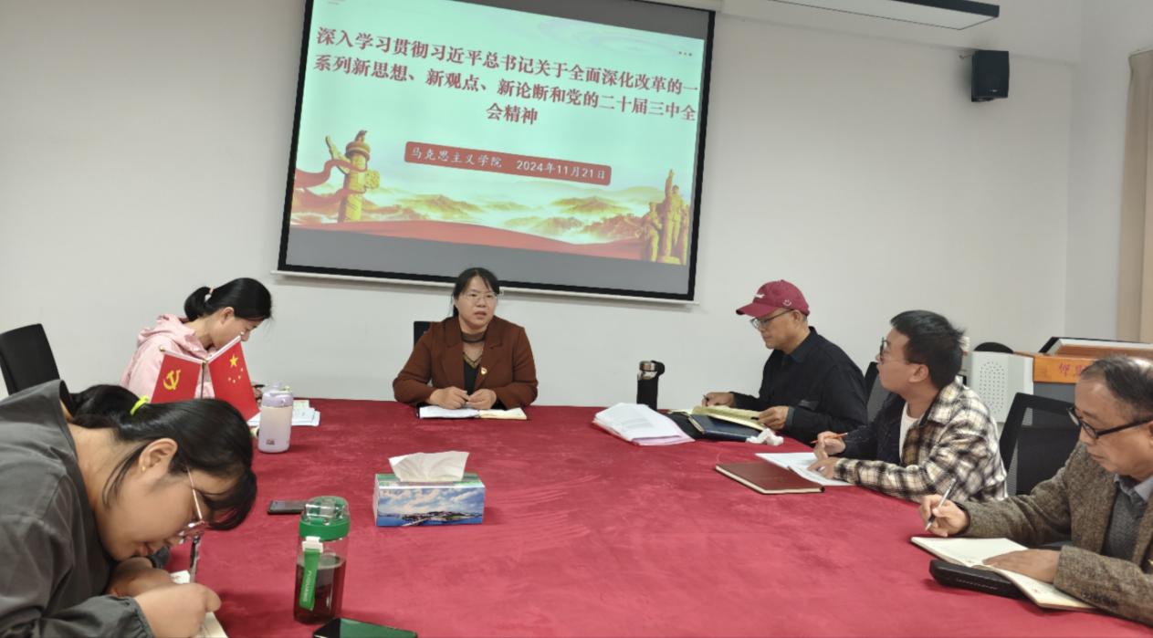 为深入学习贯彻落实党的二十届三中全会精神,引导学院全体党员、思政课教师深刻认识党的二十届三中全会的重大意义,切实把全会精神与学院工作结合起来,11月21日,beat365亚洲版官方网站党支部在普照楼316开展二十届三中全会精神学习与理论研讨活动。会议由学院党支部宣传委员赵杰主持。