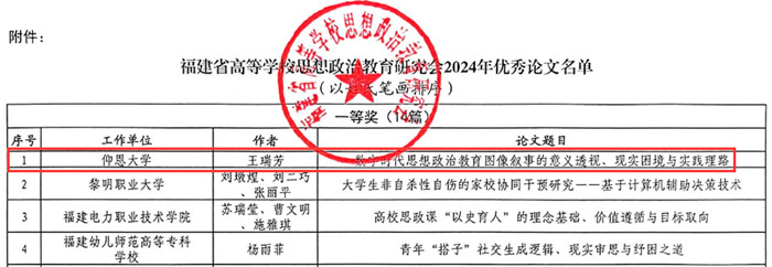 近日,福建省高等学校思想政治教育研究会发布了《关于表彰福建省高等学校思想政治教育研究会2024年优秀论文的通知》,我院选送的3篇论文均获奖。其中,王瑞芳老师撰写的《数字时代思想政治教育图像叙事的意义透视、现实困境与实践理路》获一等奖,在所有一等奖获奖论文中位列第一。孙海英老师撰写的《共情与引导:心理学赋能高校人生观教学的创新策略及实现路径》和章娇娜老师撰写的《底线思维能力视域中的总体国家安全观》获优秀奖。