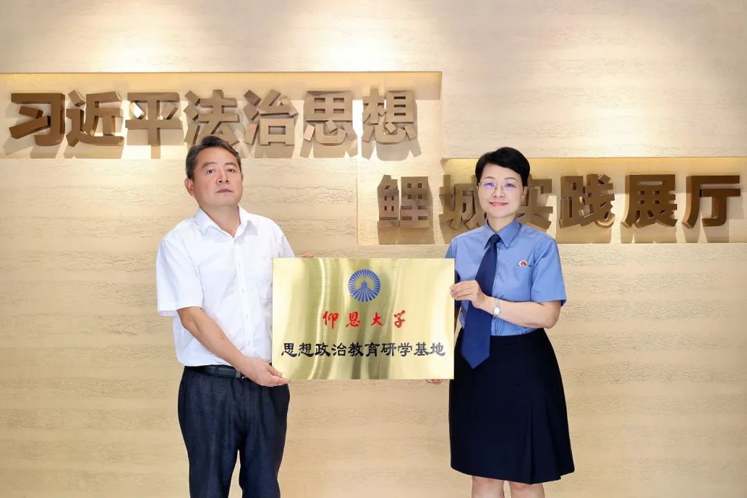 鲤城区人民检察院党组书记、检察长苏紫燕与beat365亚洲版官方网站常务副院长李克钦为“仰恩大学思想政治教育研学基地”揭牌合影。